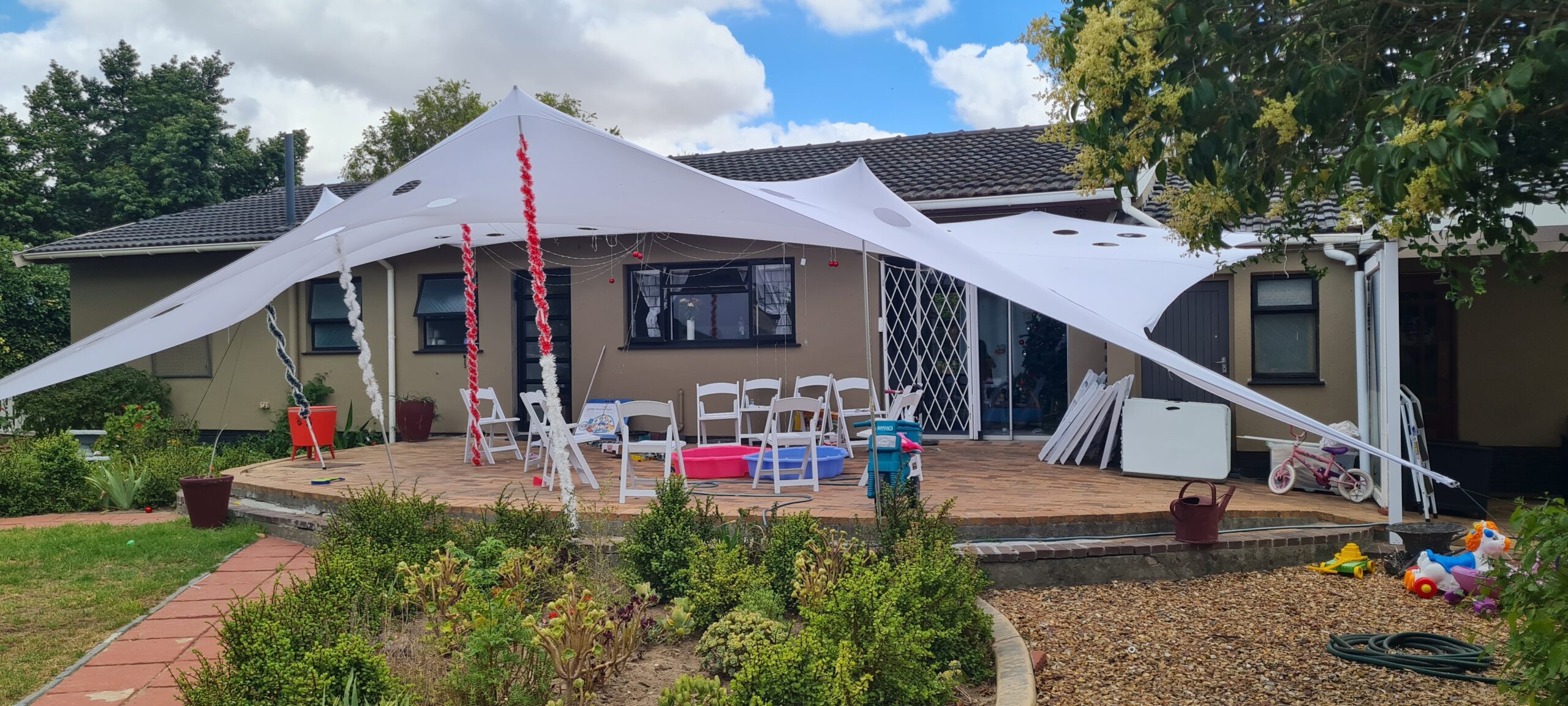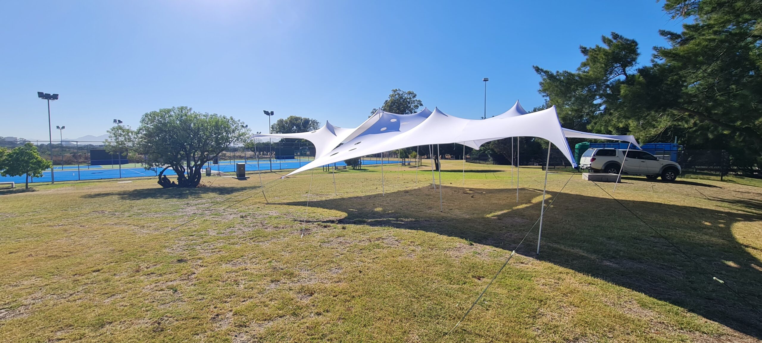 A Non-Waterproof Stretch Tent with. Approx 5 x 10 Metres and can fit up to 50.